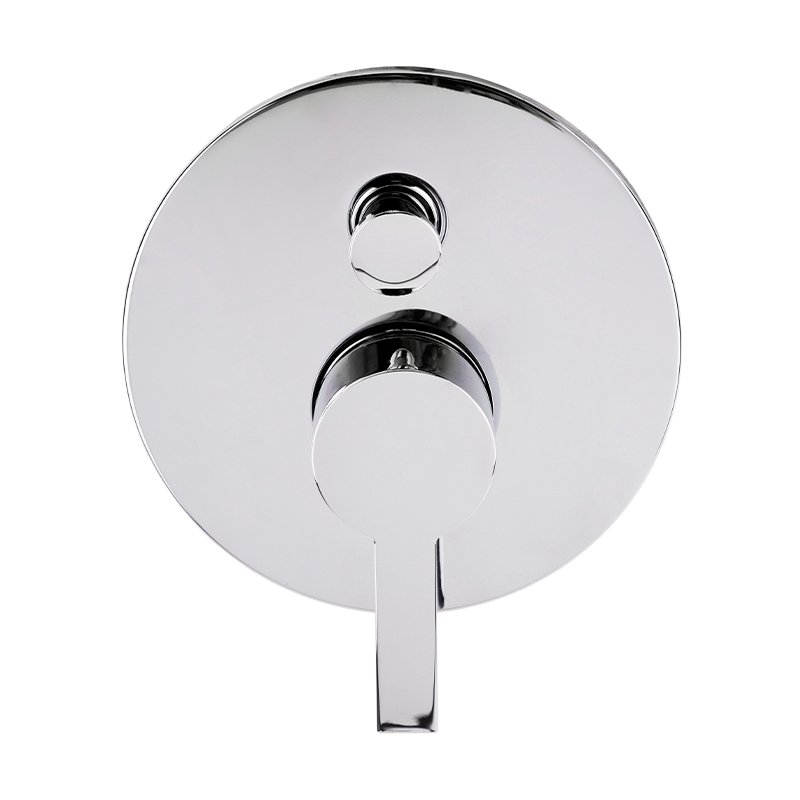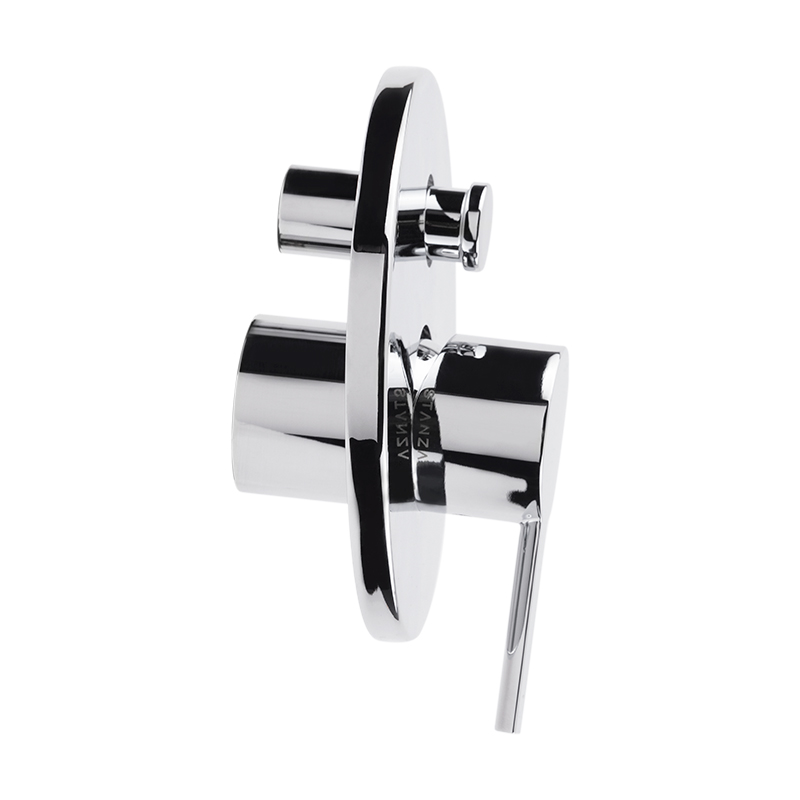 Monomando para regadera con desviador de material latón en acabado cromo. Funcionamiento en presión baja, media y alta. Colección italiana de formas curvas y elementos cilíndricos